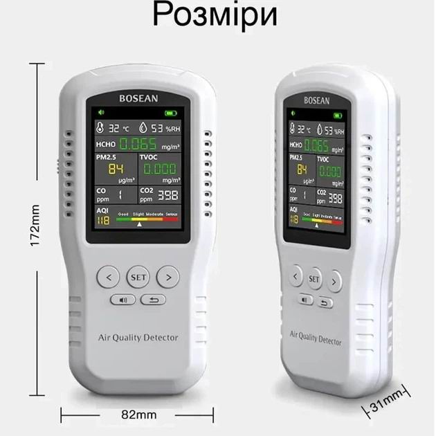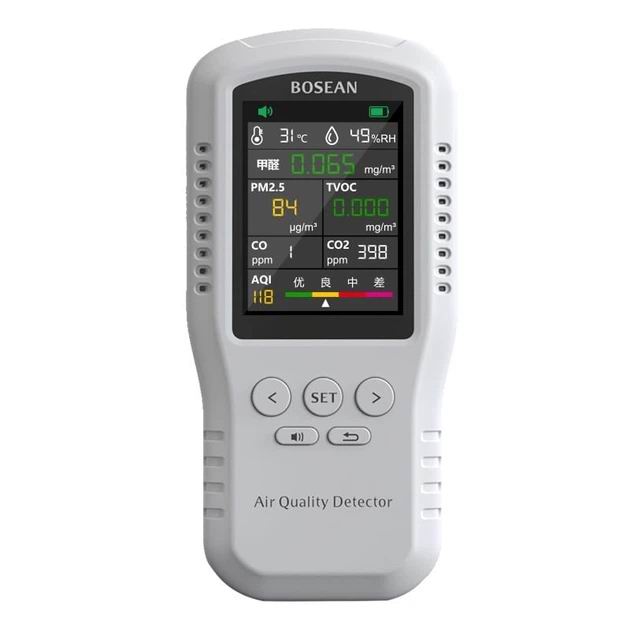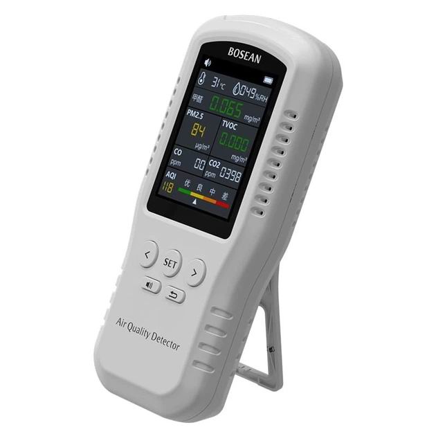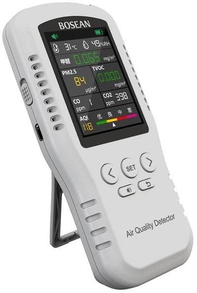 Професійний датчик аналізатор якості повітря Bosean T-Z01Pro аналізує в реальному часі якість повітря в приміщенні за 5 різними параметрами + автоматично обчислює та відбиває рівень концентрації чадного та вуглекислого газу, а також обчислює загальний індекс якості повітря AQI і показує всю цю інформацію на великому кольоровому екрані в режимі реального часу.