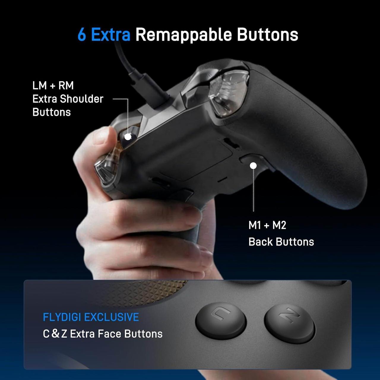 2 фіксовані задні кнопки, що налаштовуються, 2 додаткові міні-кнопки на плечі, ексклюзивні кнопки FLYDIGI CZ, що налаштовуються на лицьовій стороні, ергономічний дизайн, легке керування.