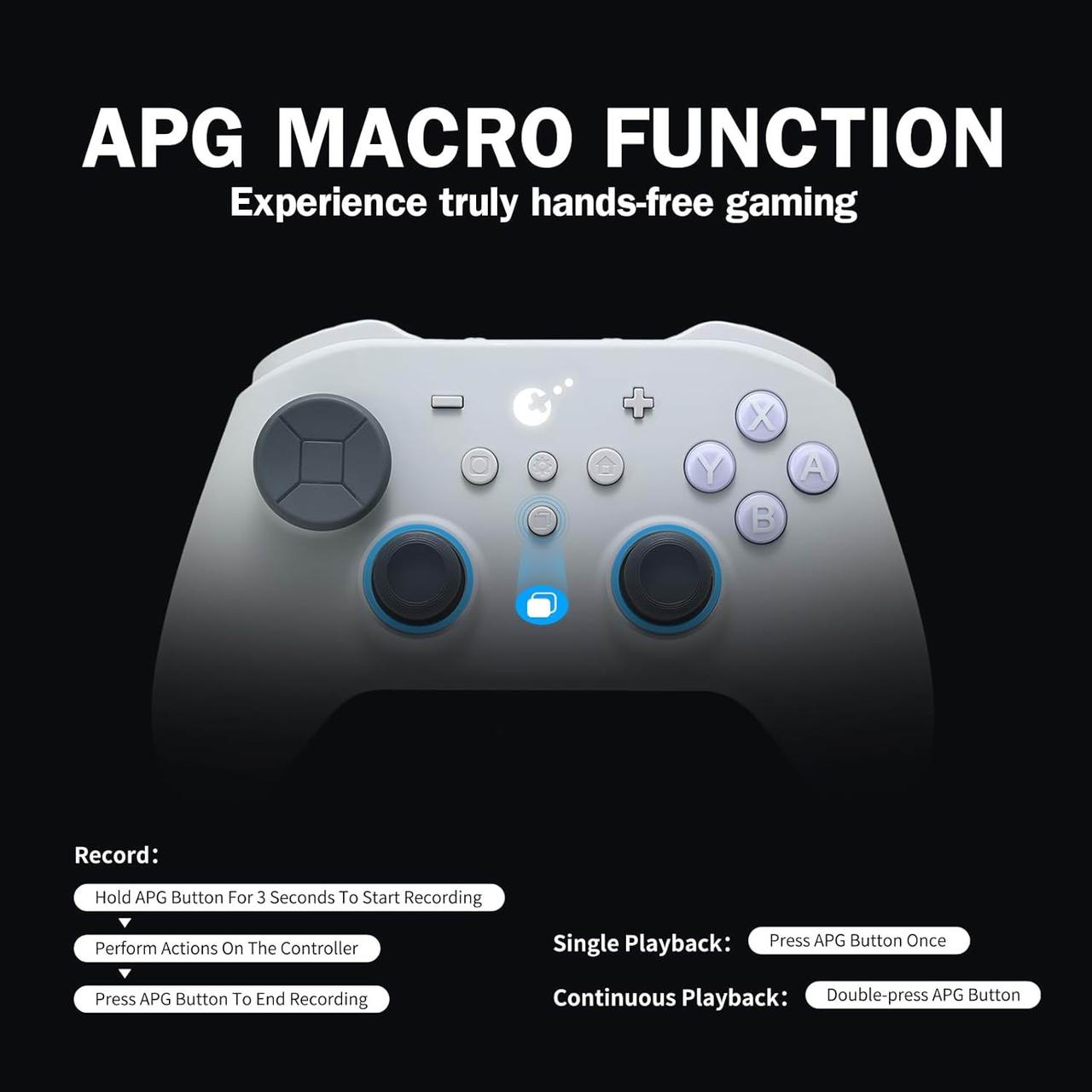 Рух гіроскопа для Switch та рухове прицілювання для ігор на ПК, функція APG для 10-хвилинного запису та автоматичного відтворення, налаштування Anti-Snapback, RGB-підсвічування, чутливість джойстика та регулювання мертвої зони, 4/8-позиційна заміна D-Pad та великий акумулятор ємністю 950 мАг.