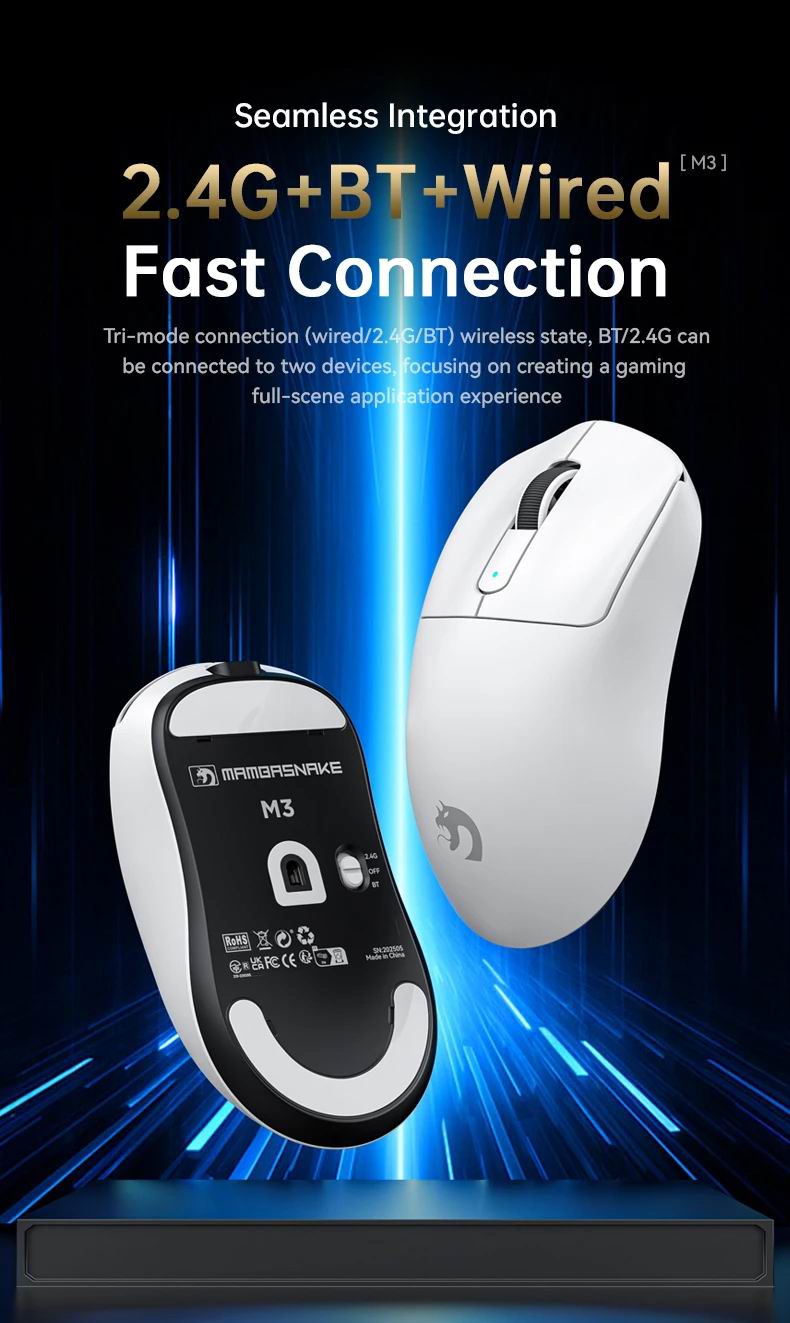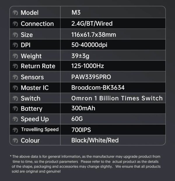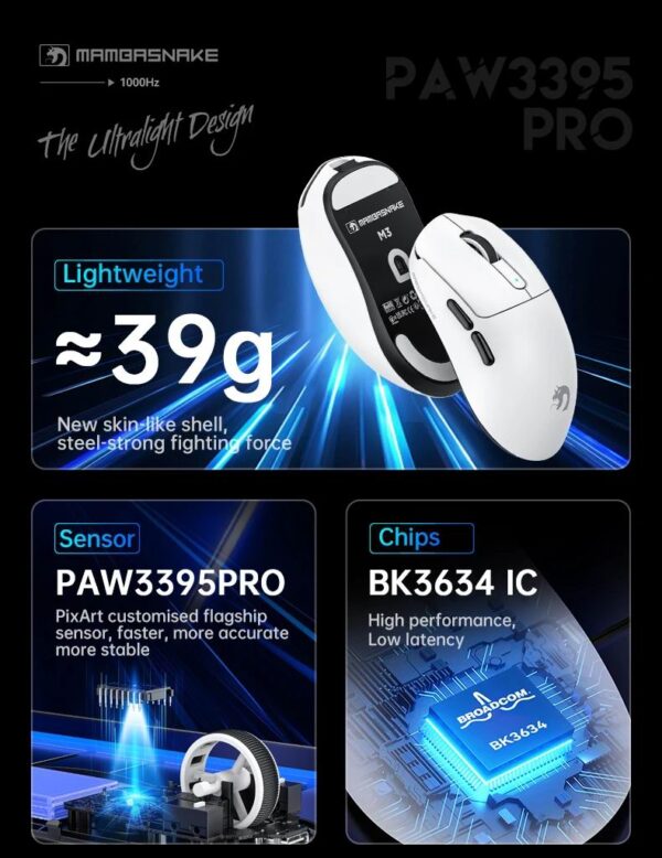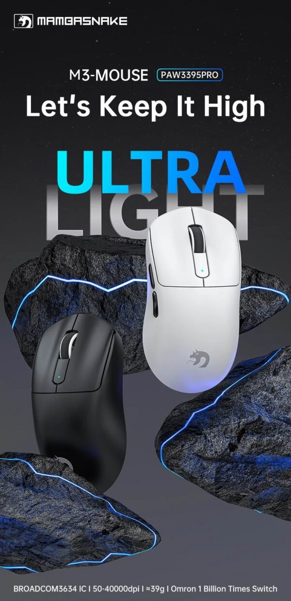 Структура миші M3 глибоко оптимізована та налаштована для забезпечення кращої системи попереднього навантаження кнопок. Вага 39±3 грами та гіпермінімалістичний дизайн забезпечують домінування в іграх від першої особи з найлегшою бездротовою ігровою мишею з повним корпусом без непривабливих отворів та компромісів у якості збірки для зменшення ваги. Легша за G Pro X та Harpe Ace. Ідеально підходить для ігор RPG, MMO, FPS, MOBA.