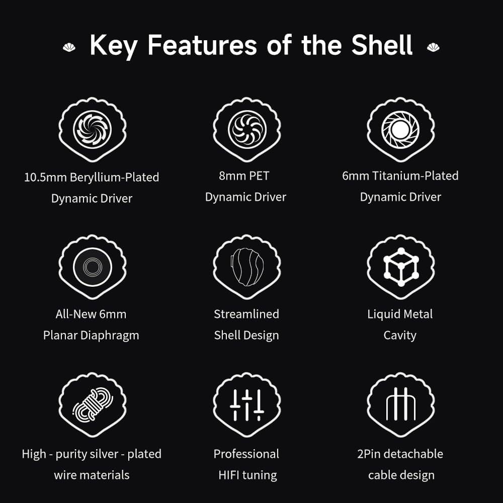- Потрійна система динамічних драйверів: Драйвери з бериллієвим та титановим покриттям працюють у гармонії, поділяючи частотні діапазони для точної передачі звуку з природним та збалансованим характером.