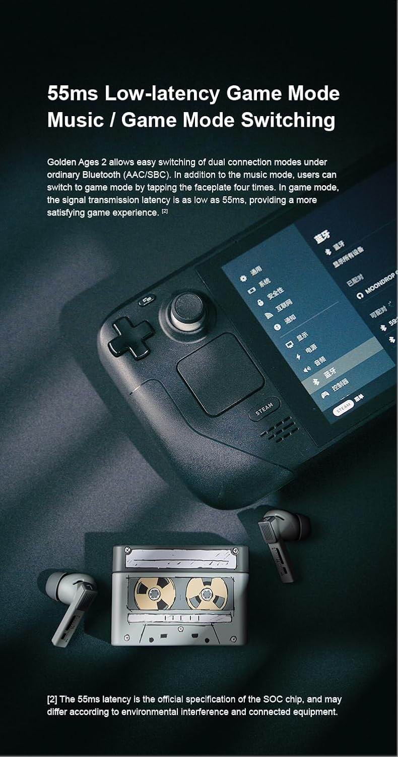 Завдяки спеціально виготовленим чіпам та вбудованим гіроскопам у навушниках, Golden Ages 2 можуть активувати спеціально налаштовану функцію «динамічного просторового звуку» через додаток MOONDROP. Користувачі можуть легко перемикатися між трьома режимами: «статичний», «малий кут» та «всеспрямований». Примітно, що інноваційний дизайн «малого кута» покращує бінауральне слухове позиціонування, регулюючи рух голови, забезпечуючи правильну орієнтацію аудіозображень під час руху. Ця функція особливо практична для відтворення звуку в різних умовах.