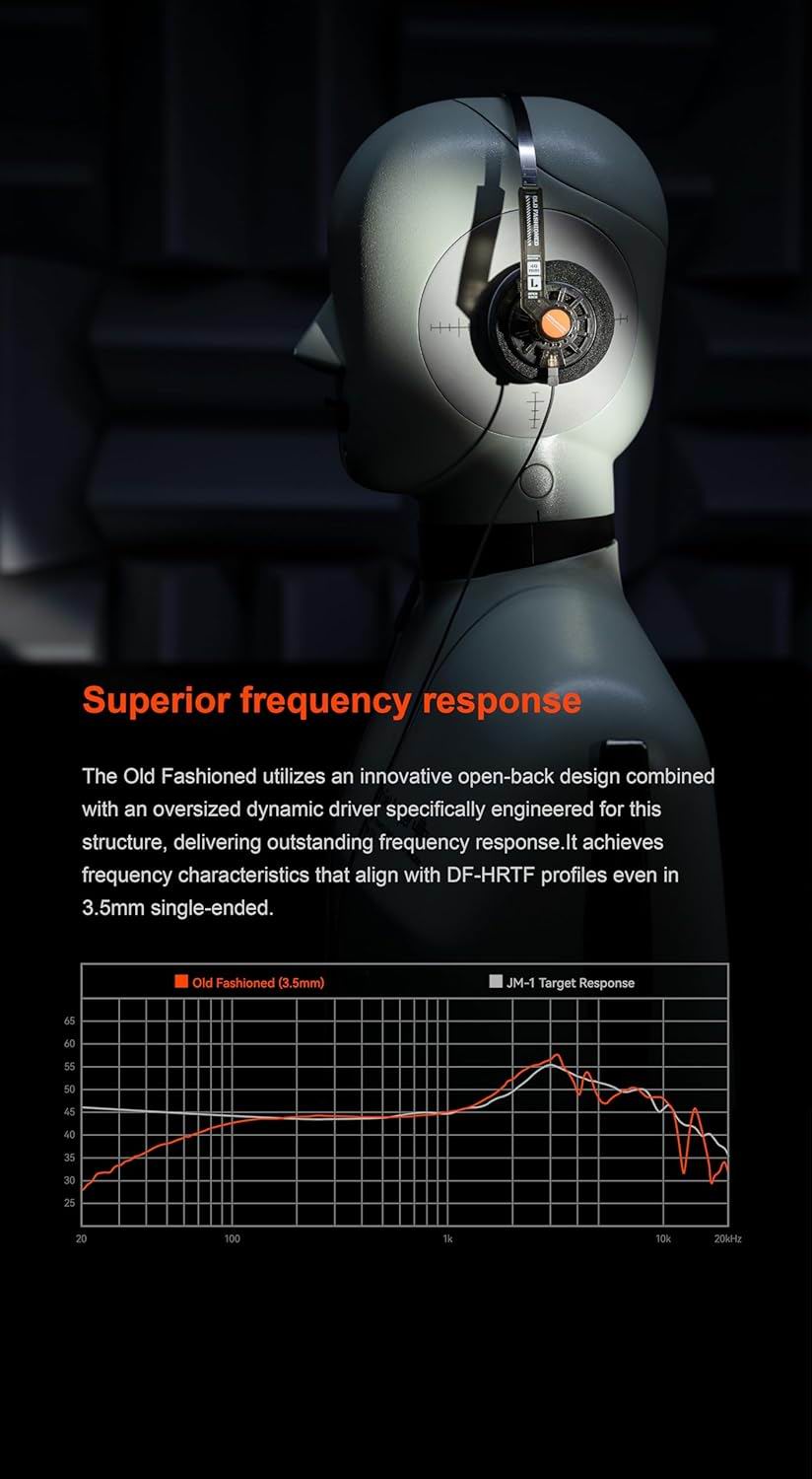 Інноваційна конструкція з відкритою задньою панеллю у поєднанні зі збільшеним динамічним випромінювачем забезпечує чудову частотну характеристику. Навіть при використанні стандартного 3,5-мм несиметричного виходу Old Fashioned досягає частотних характеристик, що відповідають DF-HRTF, гарантуючи природне, відкрите та високодеталізоване звучання.