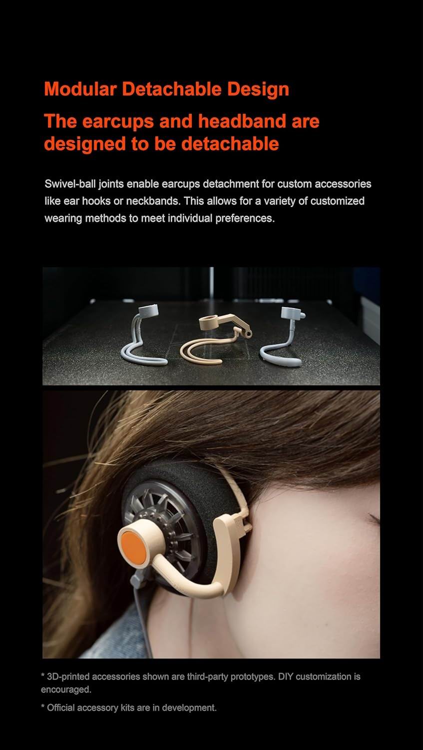 Амбушюри та оголов’я виконані в модульній, повністю знімній системі. Шарнірні з’єднання дозволяють знімати чашки навушників та замінювати їх додатковими аксесуарами, такими як завушні гачки або шийні обідки, що забезпечує різноманітні способи носіння відповідно до особистих уподобань.