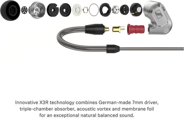 Для фахівців, які робили проєктування Sennheiser IE 900 вибір на користь конструкції з єдиним драйвером був очевидним, але вони пішли ще далі. Щоб отримати заданий рівень якості звуку, для моделі IE 900 була розроблена особлива технологія X3R, комплексна система з трьох резонаторів Гельмгольца, вирізаних методом високоточного фрезерування прямо в жорсткому алюмінієвому корпусі кожного навушника. Ці мініатюрні канали вкрай ефективно усувають усі ті резонансні піки, які, як ми всі знаємо на прикладі менш технологічних навушників, вносять негативний окрас у тональність звучання і можуть істотно псувати сприйняття композиції та враження від її прослуховування.