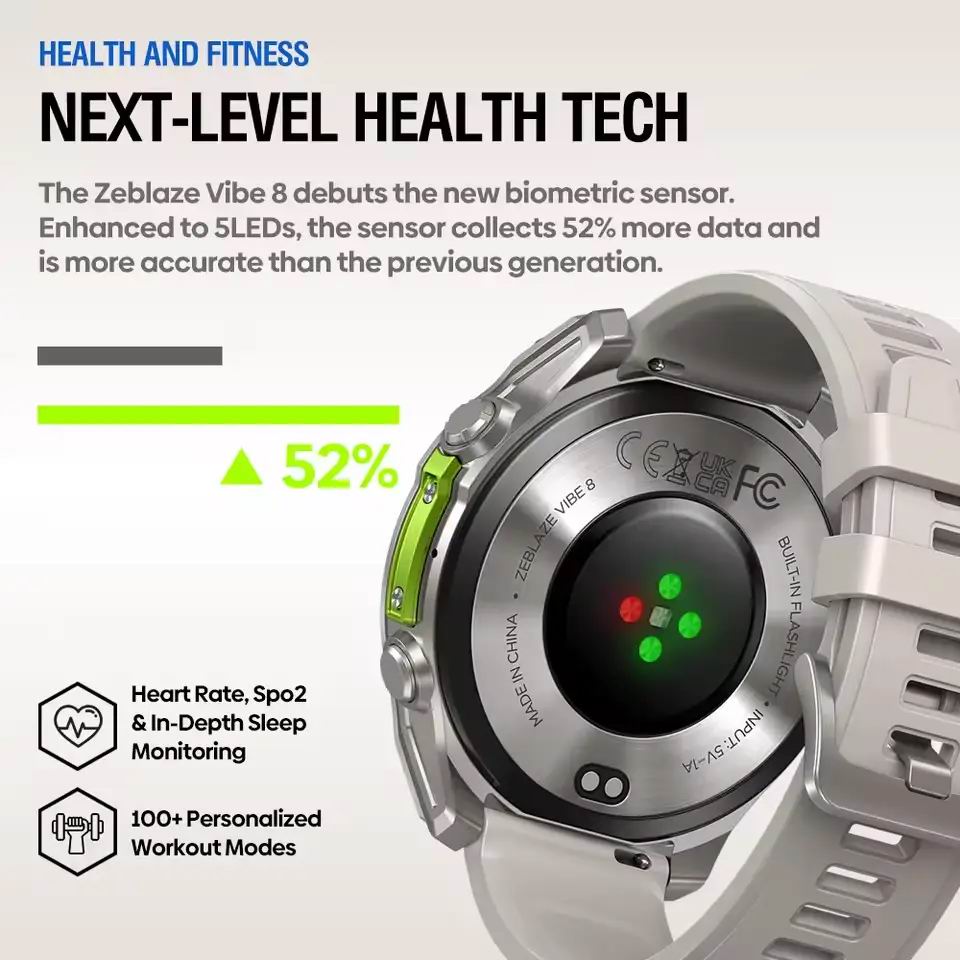 Zeblaze Vibe 8 — це міцний розумний годинник із круглим 1,43 AMOLED-екраном (466 × 466 px, до 1000 ніт), захищеним сапфіровим склом, що забезпечує чудову читаність навіть у сонячну погоду. Сертифіковано за військовим стандартом MIL-STD-810H.
