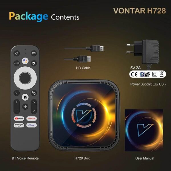 Vontar H728 працює під керуванням операційної системи Android 14, має встановлений медіаплеєр KODI 17.3 та повний доступ до Google Play маркет із тисячами додатків.