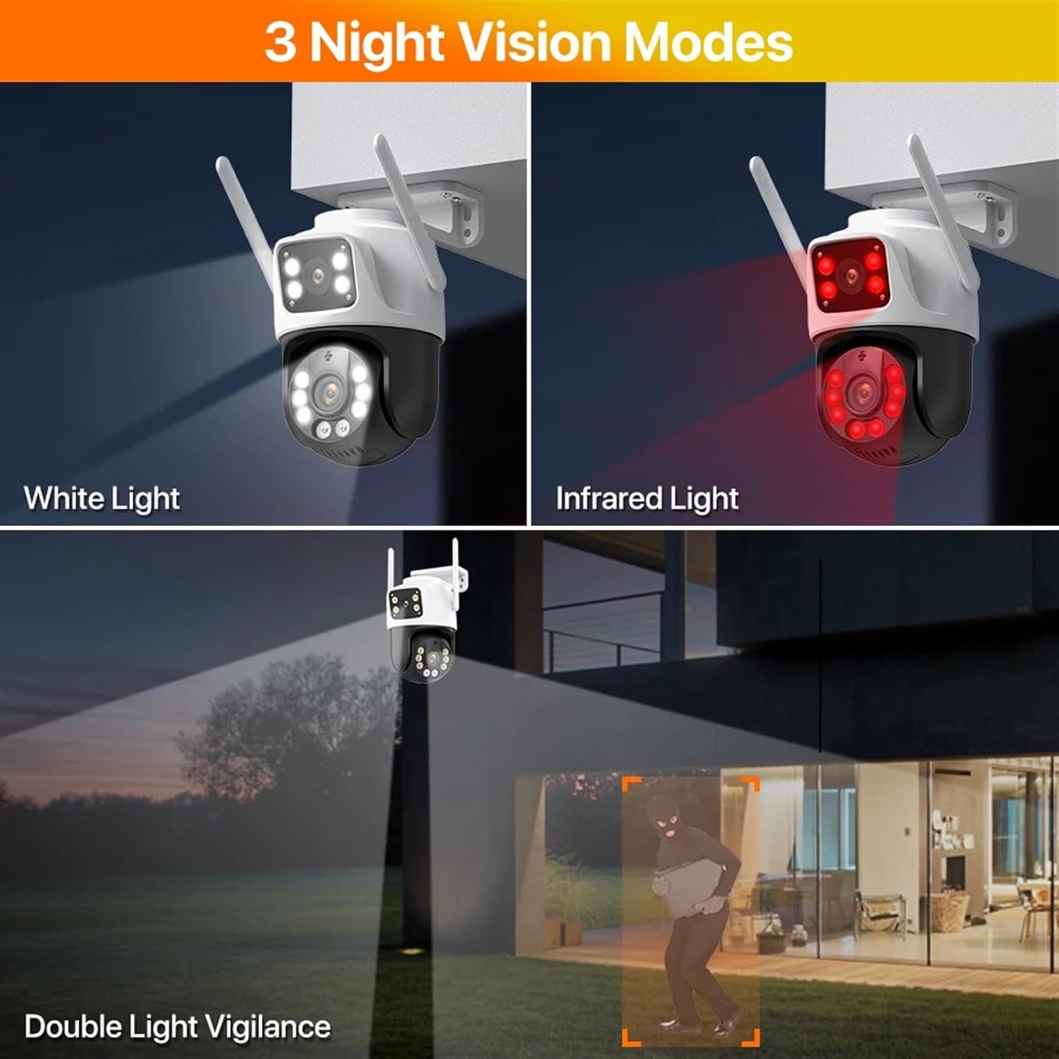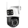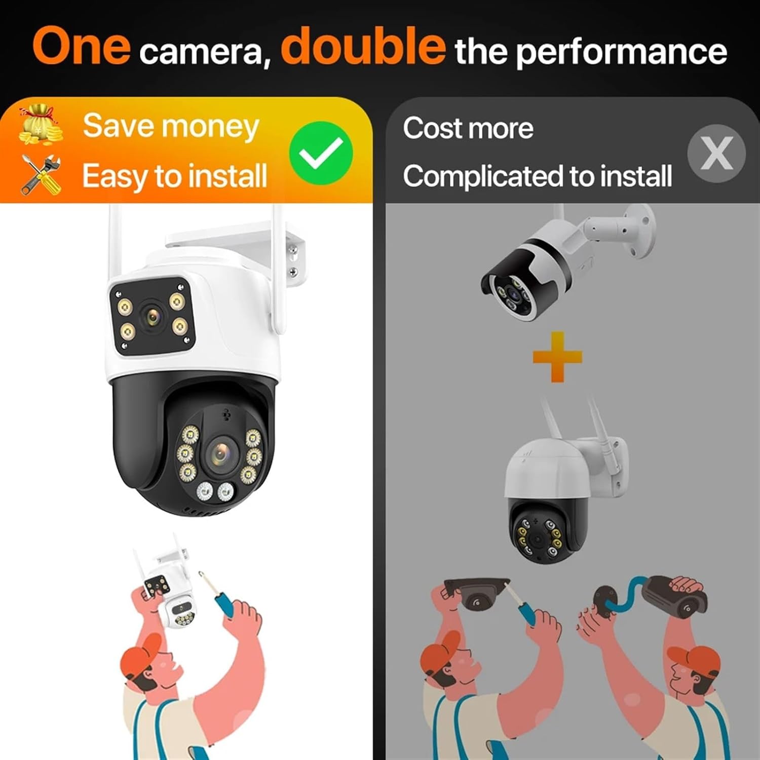 Вулична Бездротова WiFi IP-камера PTZ Онлайн відео спостереження встановлюється й налаштовується за 2-5 хвилин і замінює дві-три звичайні стаціонарні камери спостереження. Кріпимо на стіні або на стелі, на смартфон гойдаємо застосунок. Кілька хвилин на настроювання і Ви отримуєте зображення з камери на свій смартфон. Головна відмінність цієї камери від інших — вона паралельно веде трансляцію з двох камер, причому одна з них стаціонарна, а друга поворотна.