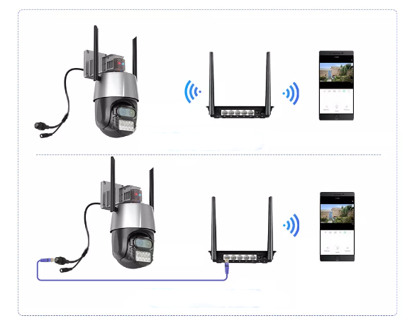 Вулична Бездротова WiFi IP-камера PTZ Онлайн відео спостереження встановлюється й налаштовується за 2-5 хвилин і замінює дві-три звичайні стаціонарні камери спостереження. Кріпимо на стіні або на стелі, на смартфон гойдаємо застосунок. Кілька хвилин на настроювання і Ви отримуєте зображення з камери на свій смартфон. Головна відмінність цієї камери від інших — вона паралельно веде трансляцію з двох камер, причому одна з них стаціонарна, а друга поворотна.