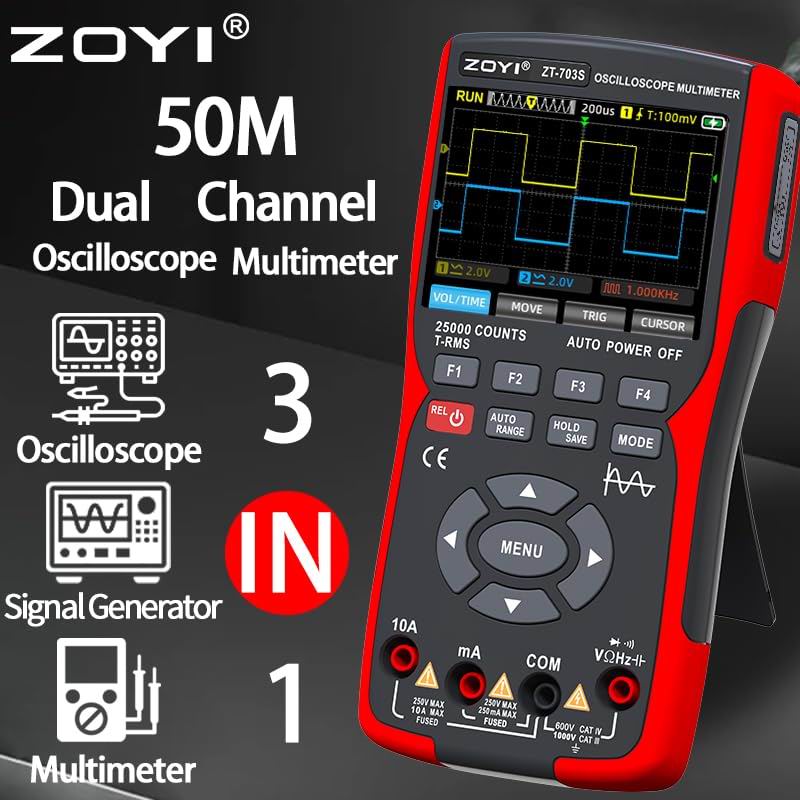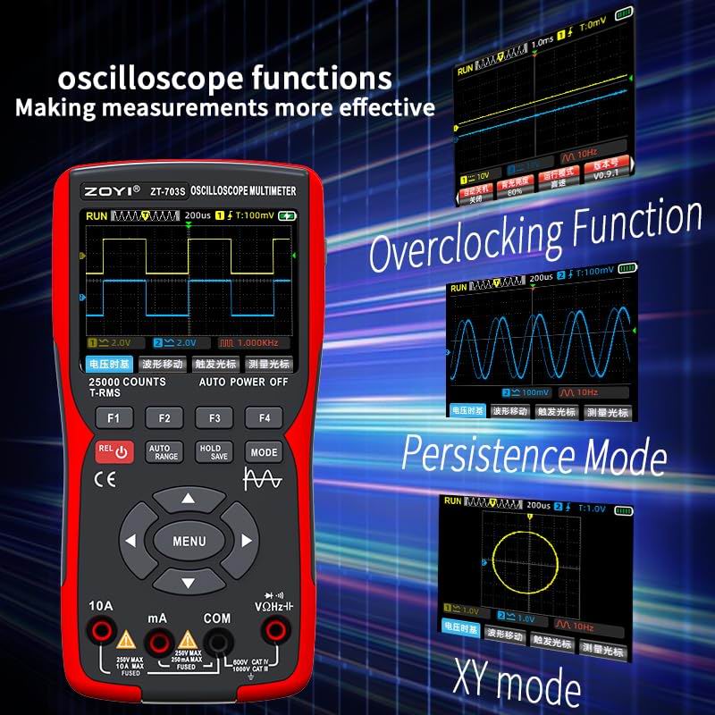 Режим осцилографа: 2-канальний портативний осцилограф, смуга пропускання 50 МГц, частота дискретизації в реальному часі 280 Мвиб/с, глибина запису 128 Кбіт/с, максимальна напруга вимірювання ±400 В, функція автоматичного вимірювання, функція автоматичного/нормального/одиночного запуску, вертикальна чутливість: зберігання та експорт зображень осцилограм 20 мВ/под. – 10 В/под.
